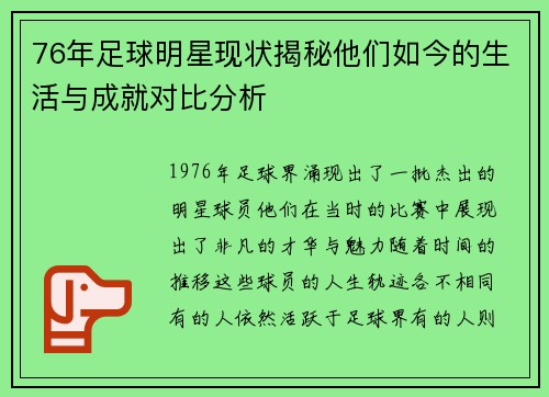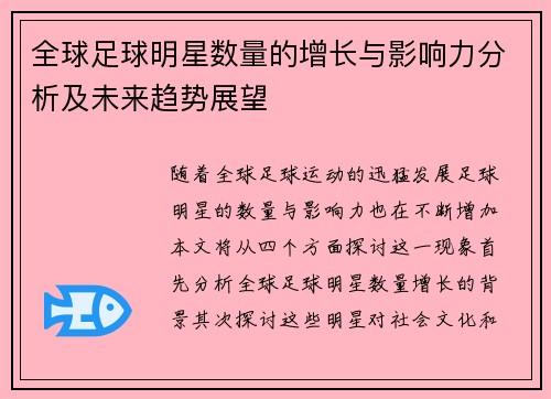 足球,作为全球最受欢迎的运动之一,不仅仅是一项竞技活动,更是无数明星运动员人生的舞台。每一位足球明星背后都有着独特而感人的故事,他们在追求荣耀和梦想的过程中,不断克服困难与挫折,最终铸就了自己的传奇人生。这些故事不仅展示了他们的毅力与决心,也反映了人性的光辉与奋斗的价值。从家庭背景到职业生涯,再到个人成就,每一个环节都深刻影响着他们的人生旅程。本篇文章将从四个方面深入探讨“每一位足球明星背后的故事...